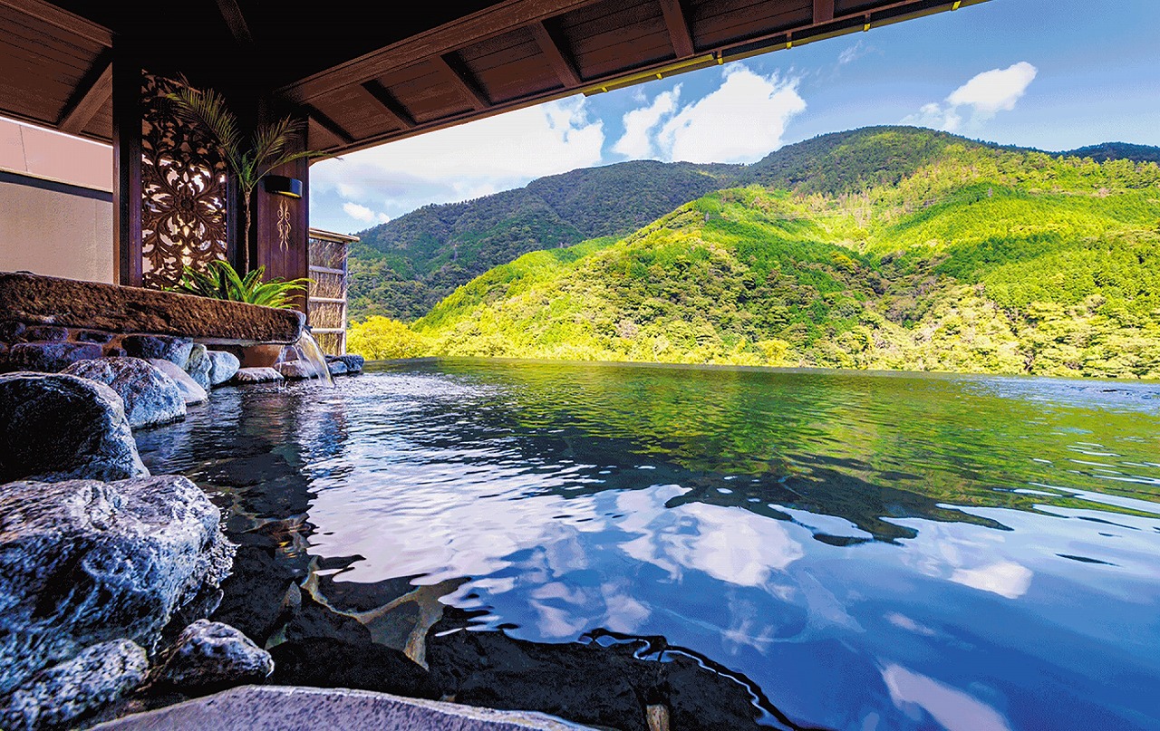 標高420mの箱根山の中腹に位置し、渓谷に溶け込むように佇む。最上階のロビーに足を踏み入れると、眼前に広がる風光明媚な景観に圧倒。客室は日本古来の風習や伝統を大切に自然と調和した和みの空間。各部屋の湯船には宮ノ下温泉が注がれ、名湯に身を委ねながら景色に酔いしれることができる。開放的な大浴場「山のインフィニティ風呂」は露天風呂とサウナを完備。日帰り利用可能な「Ginyu Spa」も併設し温泉を満喫できる。夕食は相模湾の地魚や国産和牛など、国内屈指のブランド食材を使用した懐石料理。2024年には鉄板焼きレストラン「悠庵」がオープン。洗練された上質な肉や海鮮を素材本来の味で堪能できる。