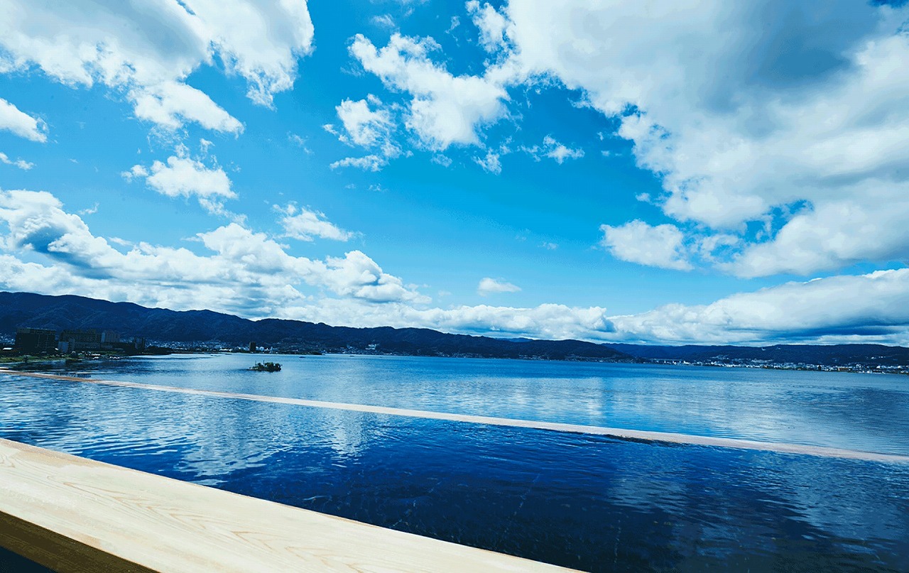諏訪湖畔に佇む「集い」と「寛ぎ」の湯宿は、大切な人と特別な時間を過ごせるよう、8室全てが諏訪湖を望む露天風呂付き客室。レイクビューの見事な眺望とともにプライベートな入浴と寛ぎを満喫できる。屋上には諏訪湖唯一の、インフィニティスタイルの展望露天風呂「綿雫」が備わり、湯浴み着を着用する混浴の湯処で大切な人と一緒に利用できる。夕食は個室料亭で、丁寧に調理した信州の幸を堪能できる。20時以降は囲炉裏のある「地酒Bar」で、諏訪地域などの銘酒をどうぞ。また、宿泊者限定の無料参拝バスで諏訪大社四社の観光も楽しめる。
